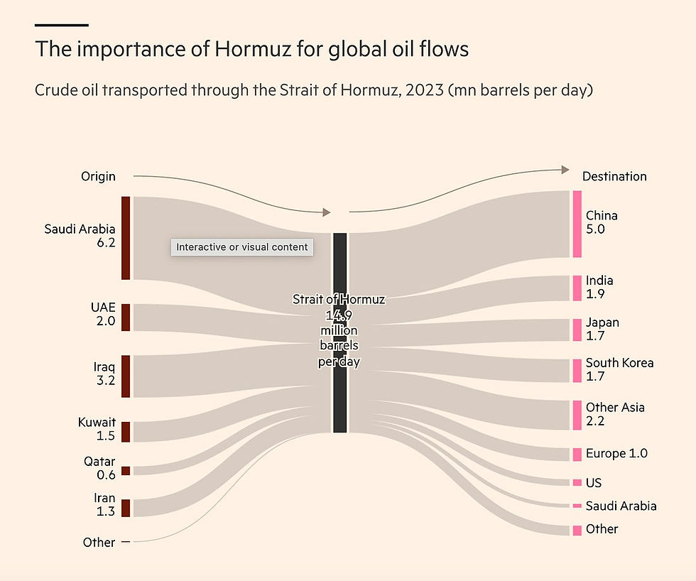 Petróleo 3. China, el mayor importador de petróleo mundial, busca que Irán permita el paso seguro de buques de crudo y gas natural licuado qatarí a través del Estrecho de Ormuz. China, que repudió el ataque a Irán, objeta el cierre del estrecho porque obtiene 45% de su petróleo de la región.